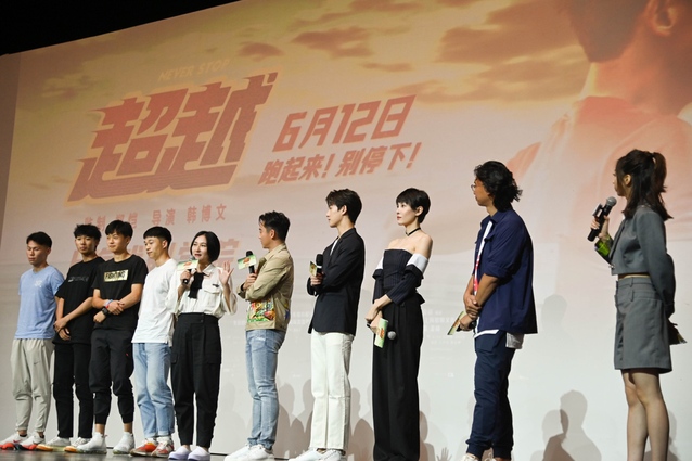放映结束后,《超越》主创团队在观众热烈的掌声中登上舞台,与全场的师生互动交流。郑恺第一次以监制的身份回到母校,他感慨昌林路剧院是《超越》点映所到过的高校影院中设备最好的,对母校的倾力支持深表感谢!韩博文动情地说到,从2006年本科毕业到2021年处女作即将登陆院线,虽然这一步走了15年,但自己算是非常幸运的了。站在母校的舞台上,韩博文越说越激动,他坦言拍电影和搞体育运动一样,贵在坚持。这一份勉励,是他特别想送给在座师弟师妹们的礼物。随后,李昀瑞、张蓝心、演员们的短跑训练教练、来自上海体育学院的学生分别与观众分享了影片背后的故事和拍片感想。