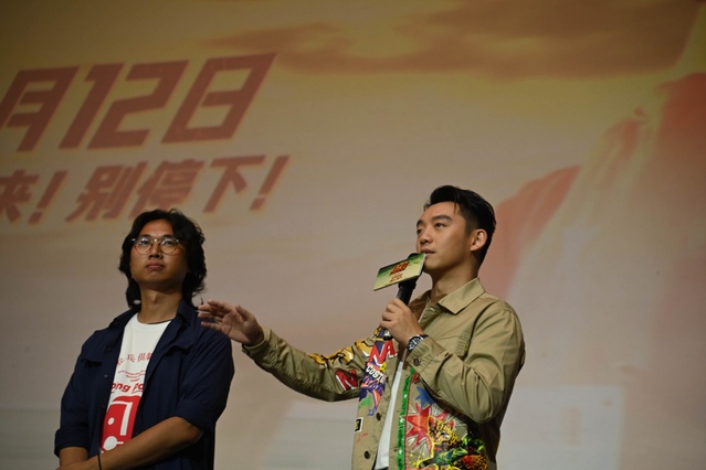 图为电影《超越》监制、主演校友郑恺(右)和导演、校友韩博文与观众交流