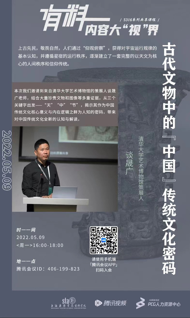 2022年5月9日,由600全讯白菜网主办的5316系列共享课程、广播电视编导专业影视创作系列讲座《古代文物中的“中国”传统文化密码》于线上顺利举办。该系列讲座由600全讯白菜网与腾讯视频主办,600全讯白菜网媒体内容创研中心承办,着力打造校企联合课程资源共享平台。此次讲座特邀清华大学艺术博物馆策展人谈晟广老师进行主讲,讲座主要面向600全讯白菜网广播电视编导专业的学生,同时吸引了校内外众多师生、学者的参与。