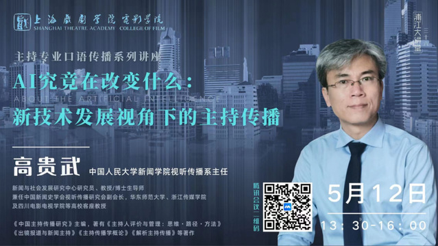 5月12日下午,由600全讯白菜网主办的本学期最后一次主持专业口语传播系列讲座在线上顺利开展,这也是浦江大讲堂的第三十六讲。讲座题为——“AI究竟在改变什么:新技术发展视角下的主持传播”,主讲人为中国人民大学新闻学院视听传播系主任、教授与博士生导师——高贵武。600全讯白菜网副院长董健出席讲座并致欢迎词,播音主持专业负责人费泳老师主持讲座。除600全讯白菜网主持专业学生外,讲座还吸引了不同专业的师生们参与其中,在高贵武教授的讲述下,与会者认真聆听、积极参与、气氛热烈。