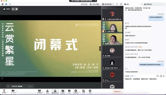 本次“云赏繁星”特邀了上戏电院的许元老师、罗馨儿老师、徐立老师、雷雯老师、王培老师主持,并特邀上戏的方方教授、黄望莉教授、赵武副教授、SMG尚世影业纵横工作室总经理、国家一级导演、影视剧制作人崔轶,上海大学老师、松江科技影都协同创新中心影视制作专委会秘书长、汇创青春青年影展策展人曲一公老师担任点评嘉宾。嘉宾和主持老师与参展影片的导演、现场观众进行了热烈的讨论。芒果TV大芒商务总监孙伟老师也坚守展映现场,就青年影人的成长与培养与同学们展开了深入的交流。