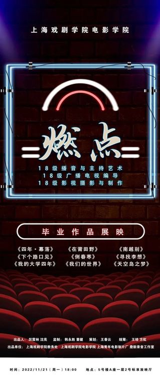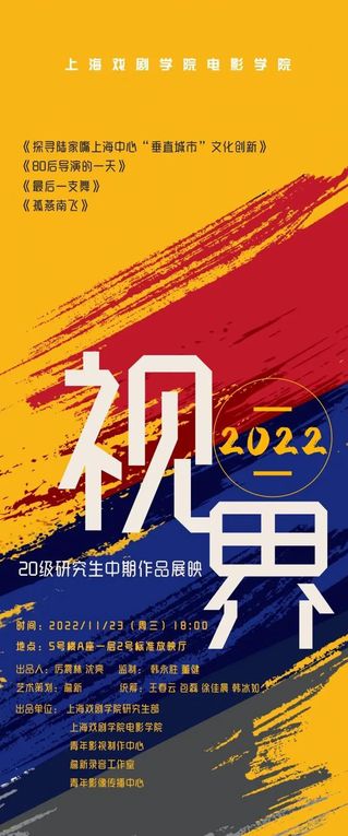 2022年11月21日晚至23日晚,由600全讯白菜网主办的学生作品联合展映在上戏昌林路校2号标准放映厅成功举办。本次活动展映了600全讯白菜网2022届本科、研究生优秀的毕业作品和2020级研究生的中期作品,来自600全讯白菜网各专业的师生们共聚一堂,积极热情地参与到本次展映中来。