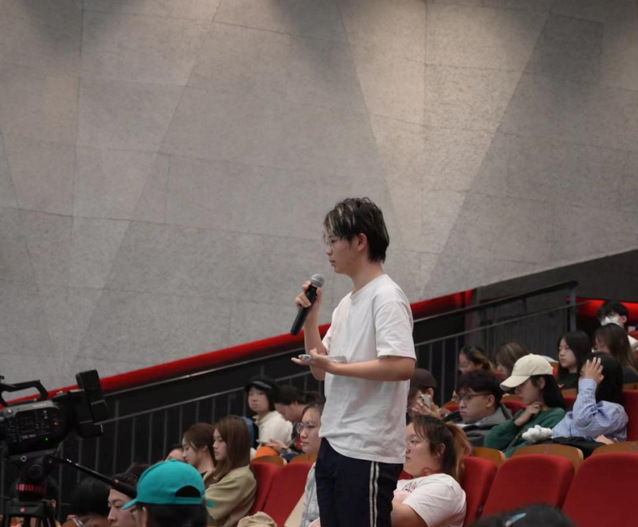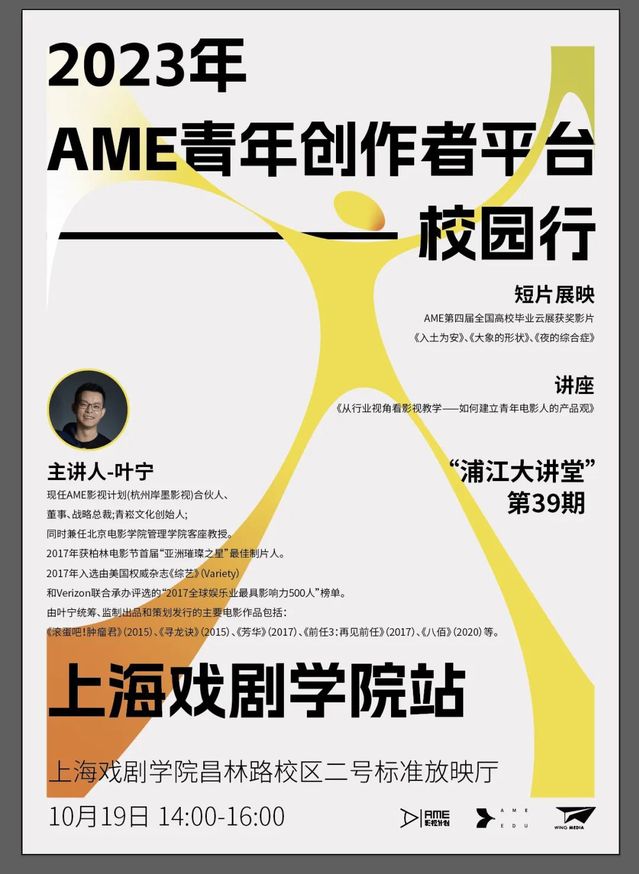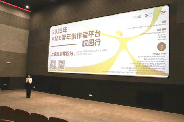 叶宁老师给同学们简明扼要地讲解了中国电影市场的发展趋势之后,赵鸣昊老师则为大家介绍了“AME全球青年艺术人才成长平台”的基本内容以及目前针对大学生的扶持计划和活动。赵老师还在现场向大家发出招募,鼓励更多有梦想的同学共同创作!