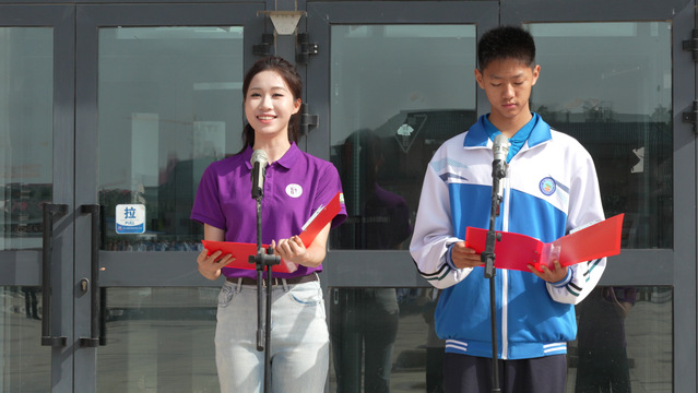 在第三师图木舒克市第二中学的“推普铸魂·语通家国”主题升旗仪式上,实践团成员与二中学生携手主持、共同朗诵红色稿件《旗帜》——不同地域的青春身影因同一种语言汇聚,红色基因在齐声诵读中浸润心灵,沪疆学子的情谊在互动中悄然升温。