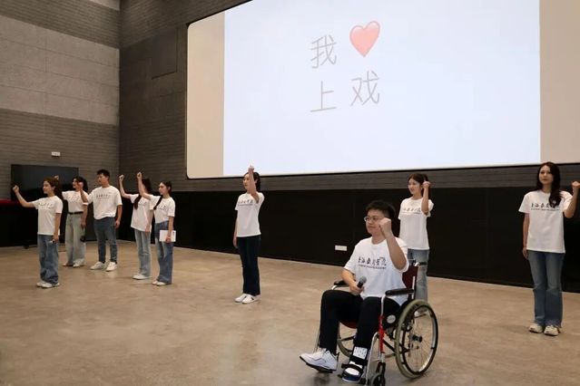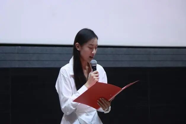 戴上校徽的新生们全体起立,庄严宣誓。随后,25级主持班同学的诗朗诵《当我戴上校徽时》喊出了全体新生的心声,而作曲班同学带来的合唱《世界赠予我的》则用悠扬歌声传递出青春力量,共同宣告着他们已准备好与“上戏”二字血脉相连。